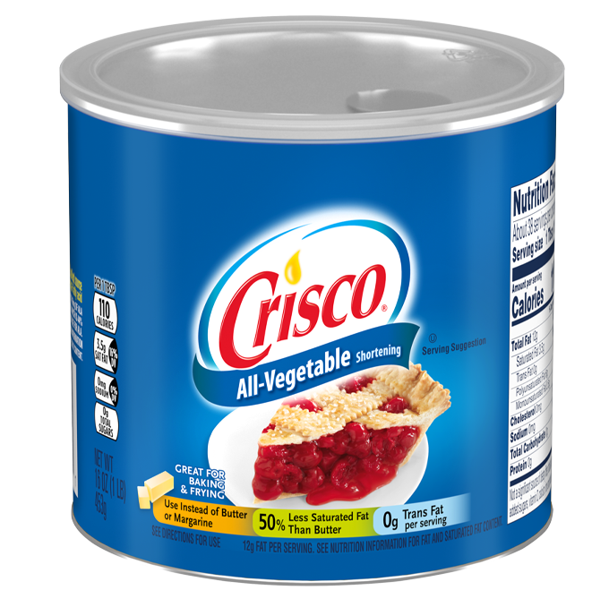 Crisco All-Vegetable Shortening is very suitable for baking and frying. The shortening contains 50% less saturated fat than butter and 0 grams of trans fat.